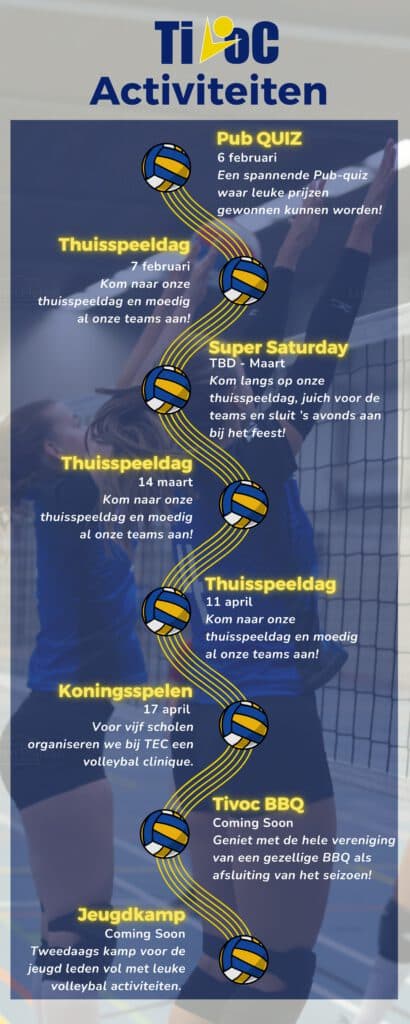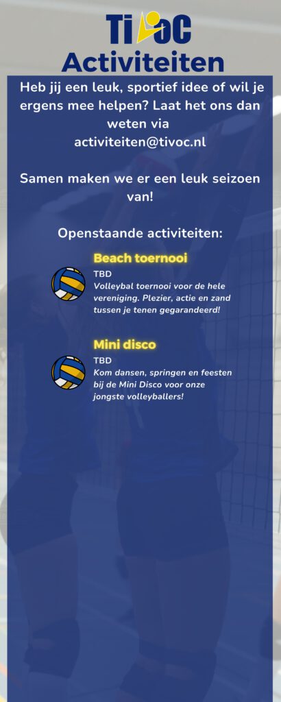 Volleybalvereniging TiVoC is een gezellige vereniging waar je kunt volleyballen op verschillende niveaus. We hebben dames- en herenteams in de Nevobo-competitie en de recreantencompetitie. Bij de jeugd hebben we zowel meisjes- als jongensteams en de jongste leden van de vereniging spelen Circulatie Mini Volleybal (CMV). Verdere informatie over de huidige teams, niveaus en trainingstijden vind je onder het tabblad teams.